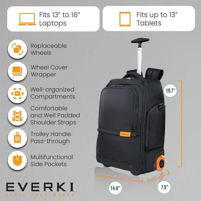 COMFORTABLE AND ERGONOMIC DESIGN: The rolling backpack features smooth, replaceable wheels and a telescoping handle for easy maneuverability, ideal for airport travel. Padded shoulder straps can be hidden for effortless carrying, reducing strain during long travels through crowded terminals or offices.. ^^ IDEAL FOR FREQUENT FLYERS AND ROAD WARRIORS: Designed for professionals constantly on the move, this rolling backpack is idela for consultants, field engineers, and IT specialists. Its compact, carry-on size makes airport travel easier while providing quick access to laptops, tools, and essentials for efficient business trips. ^^