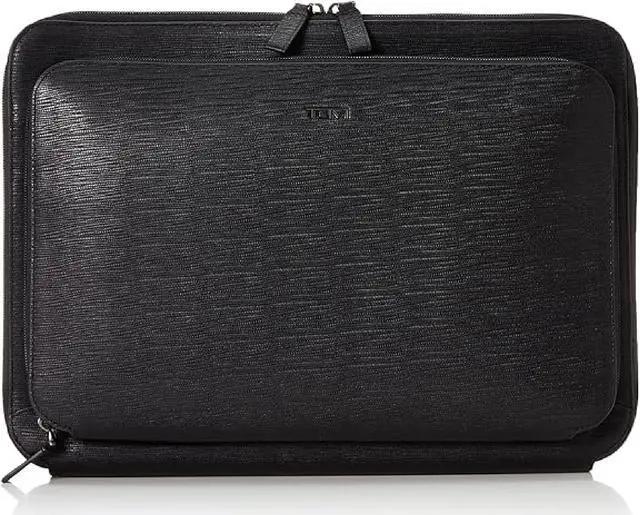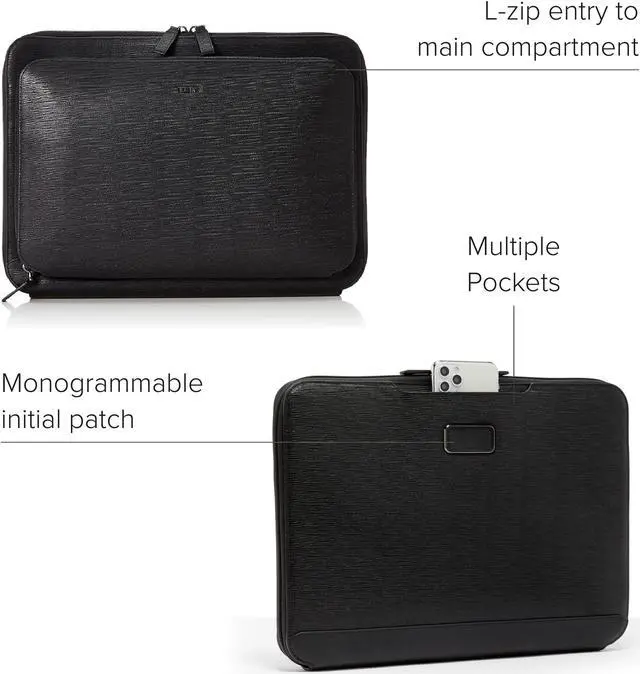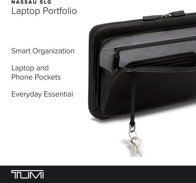 Travel comfortably and in style with the Nassau Laptop Portfolio from TUMI, crafted for the modern-day professional. This sleek black laptop bag is meticulously designed to accommodate 14-inch laptop screens, ensuring your device is secured in a dedicated padded compartment. The streamlined silhouette of this business bag resonates with both men and women, blending functionality with elegance. Thoughtful organization in the form of multiple pockets including a phone pocket, pen loops, and a key leash makes it the quintessential computer bag for those who appreciate meticulous craftsmanship and efficiency.