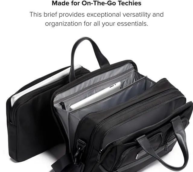 DescriptionWith a removable laptop sleeve for up to 15'' screen laptops, an expandable main compartment, and an accordion file organizer, the TUMI Alpha Expandable Organizer Laptop Briefcase provides exceptional versatility and organization. Features include a padded tablet pocket and multiple pockets for accessories. The exterior has two U-zip pockets including one with a water-resistant lining for an umbrella or water bottle. Part of our Alpha Collection, iconic business and travel pieces that bring together innovative design, superior performance, and best in class functionality. Select styles come outfitted with a colorful TUMI Accents Kit (luggage tag, monogram patch, handle wrap and zipper pull ties) for an additional cost.