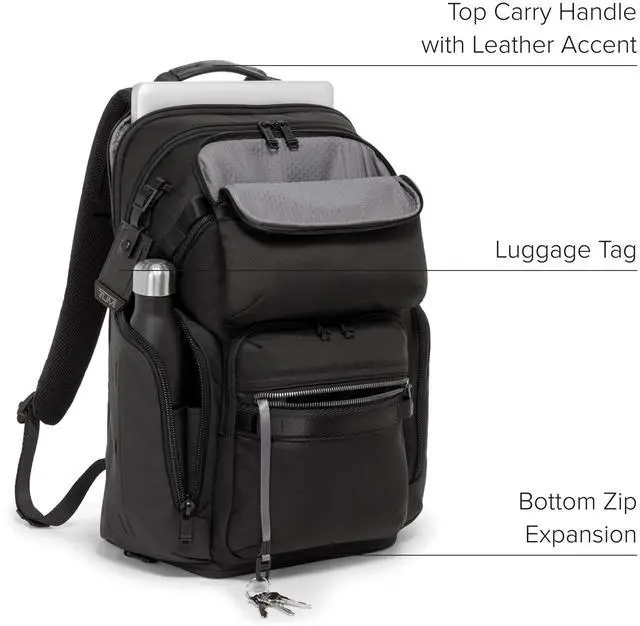 • Tech Backpack Interior: This travel laptop backpack boasts a padded compartment for laptops up to 15", TUMI Tracer, and various pockets for tech and essentials