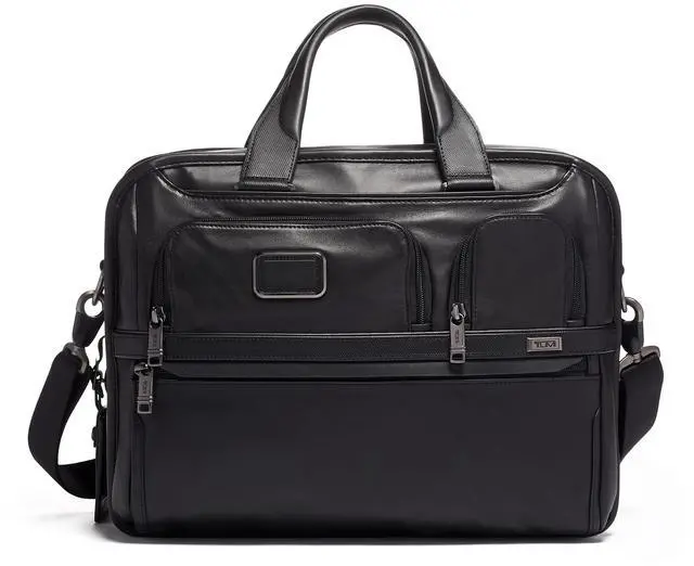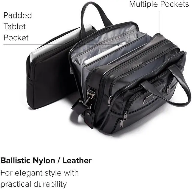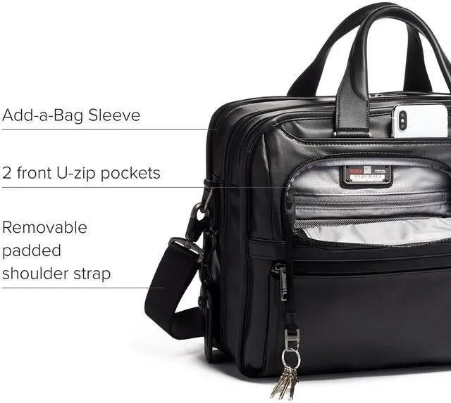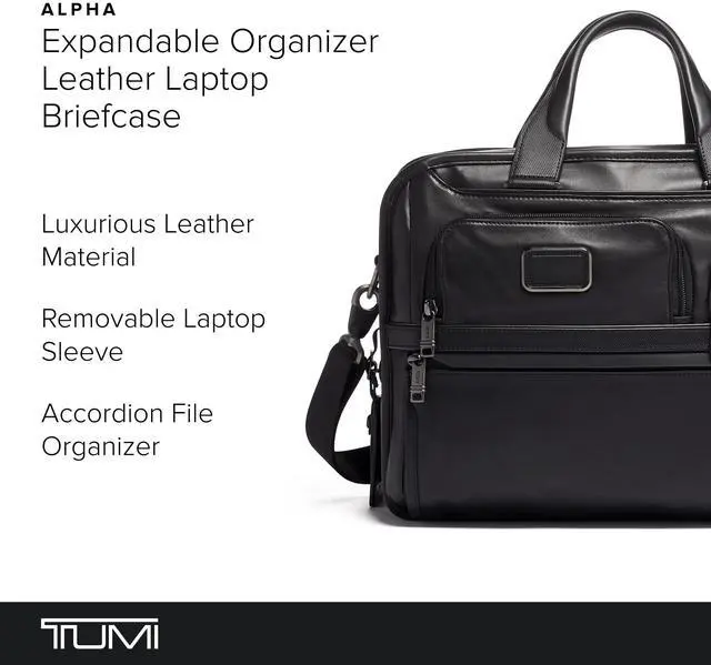 DescriptionWith a removable laptop sleeve for up to 15'' screen laptops, an expandable main compartment, and an accordion file organizer, the TUMI Alpha Expandable Organizer Laptop Briefcase provides exceptional versatility and organization. Features include a padded tablet pocket and multiple pockets for accessories. The exterior has two U-zip pockets including one with a water-resistant lining for an umbrella or water bottle. Part of our Alpha Collection, iconic business and travel pieces that bring together innovative design, superior performance, and best in class functionality. Select styles come outfitted with a colorful TUMI Accents Kit (luggage tag, monogram patch, handle wrap and zipper pull ties) for an additional cost.