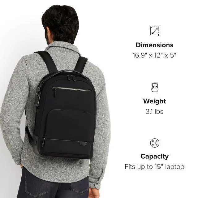 DescriptionTravel comfortably and in style with the TUMI Harrison Warren backpack, a quintessential companion for the discerning professional. This sleek and sophisticated backpack offers a protective, padded 15-inch laptop compartment that ensures your technology stays safe during your urban commutes or while jet-setting across continents. With its expertly designed organizational compartments, this professional laptop backpack ensures all your business essentials are neatly and securely in place. As a business backpack, the Harrison Warren doesn't compromise on aesthetics or functionality. Its thoughtful design includes quick-access pockets, ensuring that your essentials are always at your fingertips.