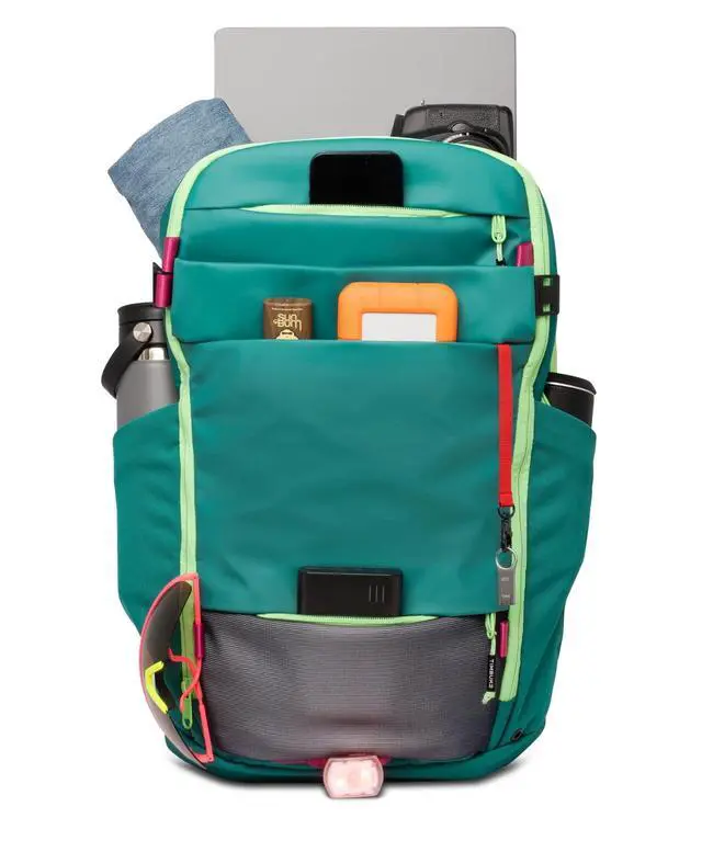 KEEP IT ORGANIZED: Internal laptop sleeve (up to 15") with hook and loop flap; 35L capacity plus expansion zipper for when you're carrying a little extra; Dual side pockets, perfect for hydration and your lock; Quick access pockets on front, one tricot lined for electronics; Quick side access zipper for laptop; Zip top closure for easy access to interior ^^