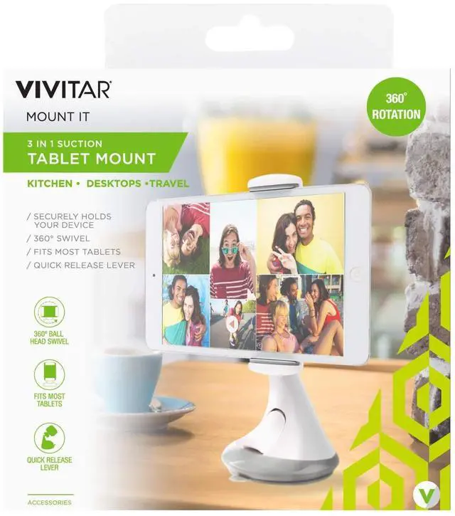 The Vivitar 3-in-1 Suction Tablet Mount is a convenient way to keep your tablet at the perfect viewing angle. The mount securely holds most tablets, mounts securely to most flat surfaces and can swivel 360 degrees. It also has a quick-release lever and is easy to move and re-stick as you please. Go hands-free, reduce eye and neck strain, and make browsing on your tablet a breeze.