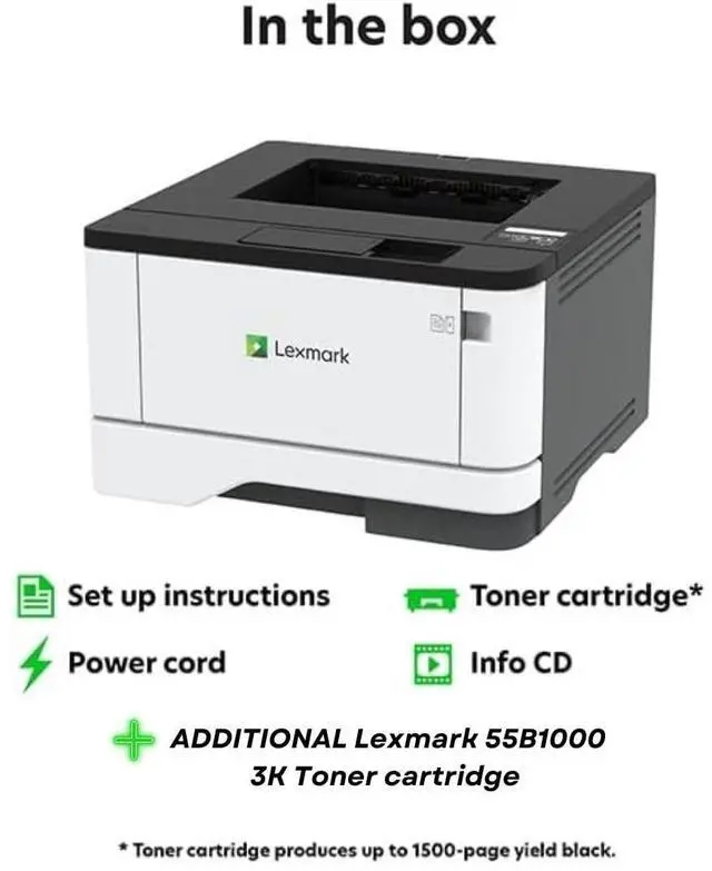 Includes MS331dn Laser Printer and (1) starter toner cartridge (produces up to 1,500-page yield black)