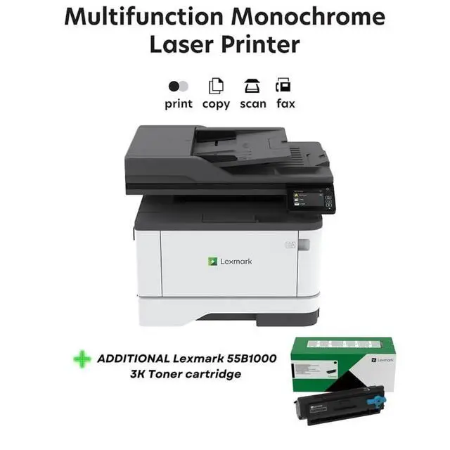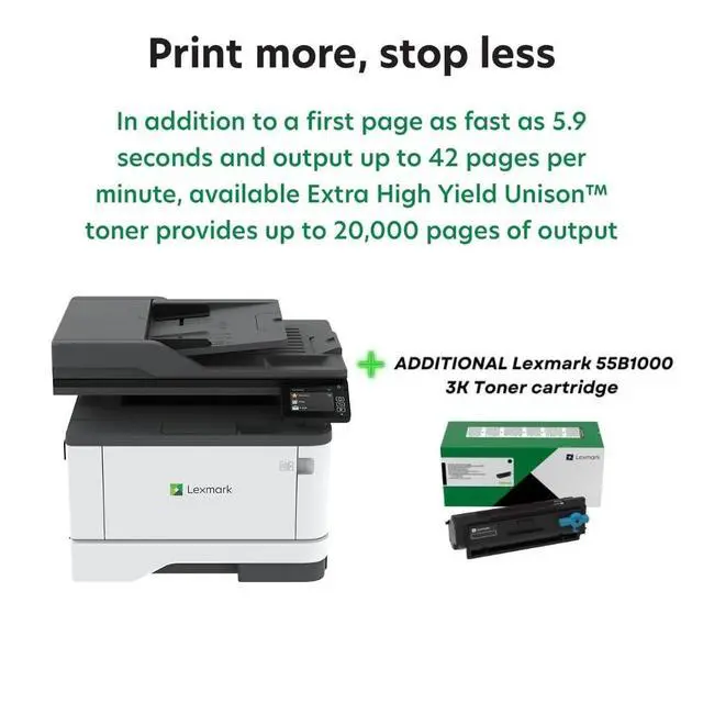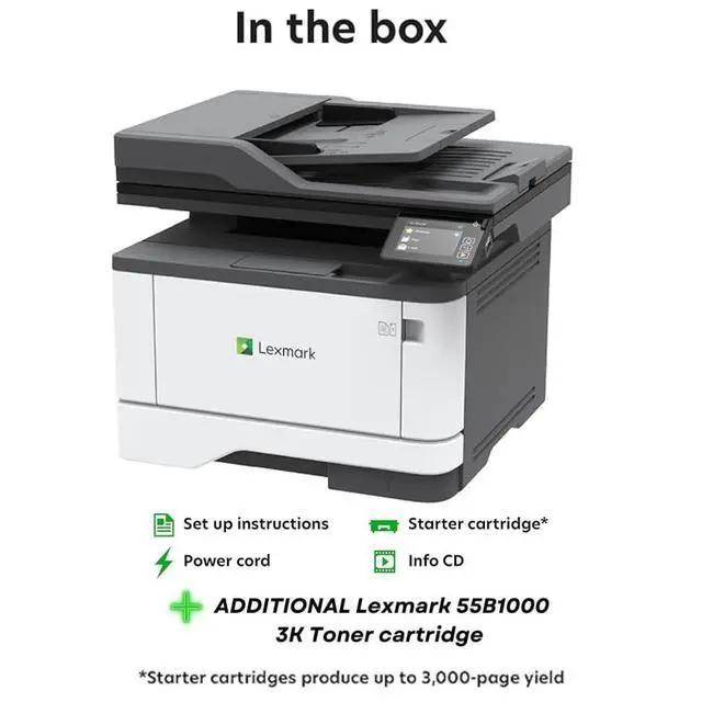 Includes MX431adn Laser Printer and (1) starter toner cartridge (produces up to 3, 000-page yield black) ^^ (1) Lexmark 55B1000 3K Yield Toner Cartridge for additional value ^^