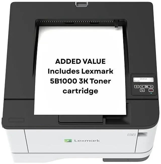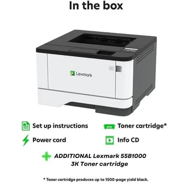 Includes MS331dn Laser Printer and (1) starter toner cartridge (produces up to 1, 500-page yield black) ^^ (1) Lexmark 55B1000 3K Yield Toner Cartridge for additional value ^^