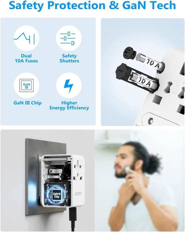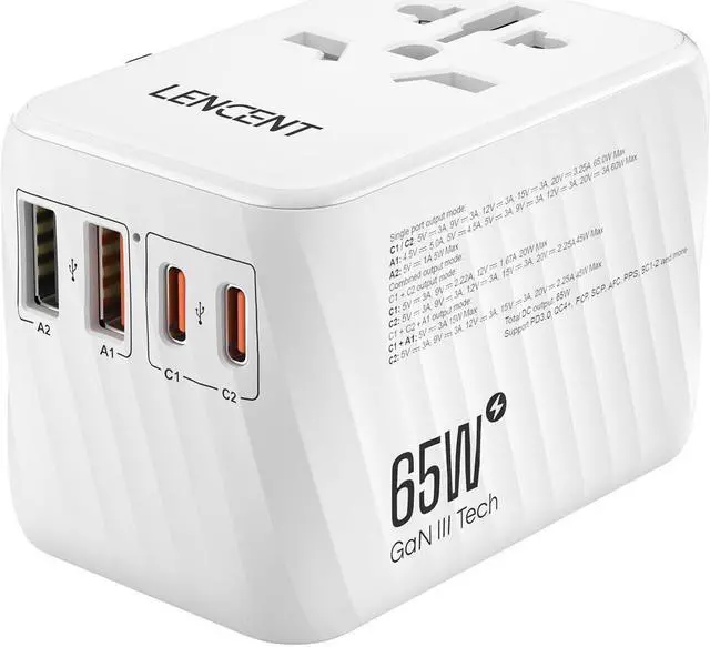LENCENT Universal Travel Adapter, 65W GaN International Fast Charger with 2 PD3.0 Type C+2 QC USB A, Worldwide Power Adaptor for Phones,Laptops, All in One Travel Essentials for EU/USA/UK/AU, White
