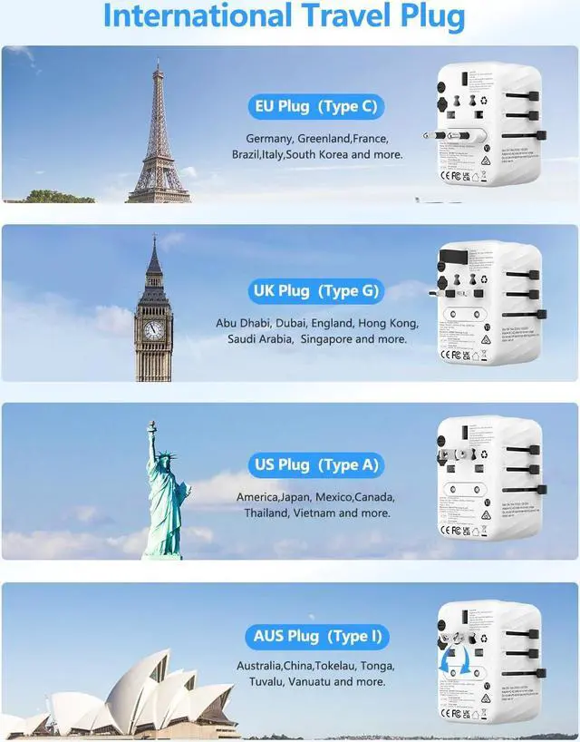 [(Ideal for Travel)] This International travel adapter is equipped with 4 interchangeable UK/US/EU/AUS plugs, and supports universal voltage of 100V-250V, which is suitable for worldwide travel for over 200 countries. Type C Plug: Most of Europe, France, Germany, Italy, Spain, Iceland, Greece, Israel; Type G Plug: UK, Ireland, London, England, Scotland, Dubai; Type I Plug: China, Australia, New Zealand; Type A Plug: USA, Japan, Canada. Take this travel essentials along on your next trip and enjoy your holiday!