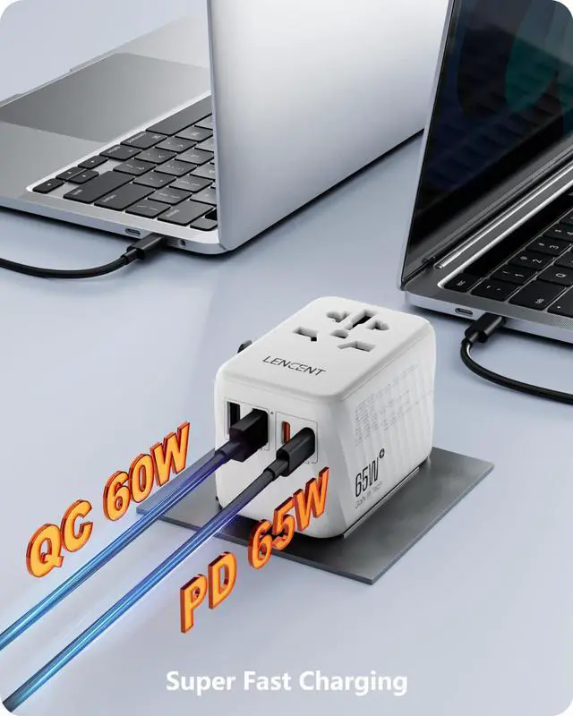 LENCENT Universal Travel Adapter, 65W GaN International Fast Charger with 2 PD 3.0 Type C+2 QC USB A, Worldwide Power Adaptor for Phones, Laptops, All in One Travel Essentials for EU/USA/UK/AU, White