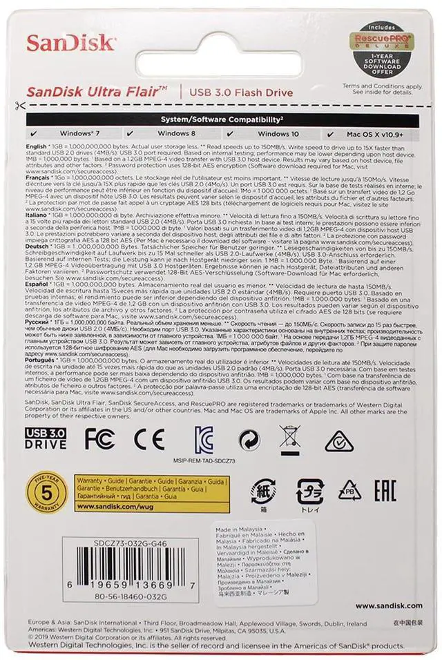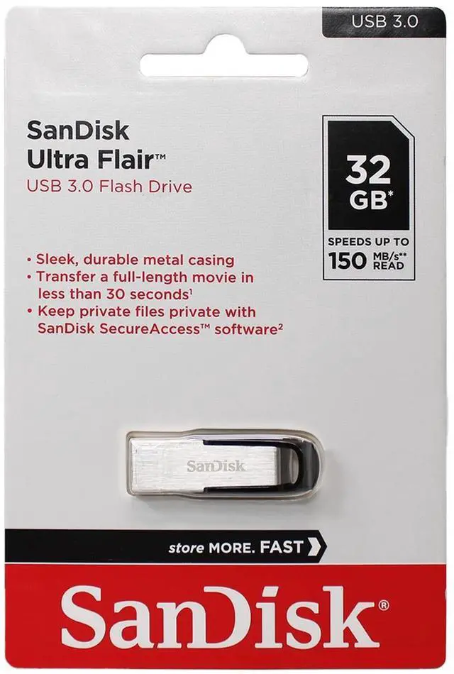 Offering transfer speeds of up to 15X faster than standard USB 2.0 drives, the SanDisk Ultra Flair USB 3.0 Flash Drive is designed to move your files fast, so you spend less time waiting. For example, you can transfer a full-length movie in less than 30 seconds. The drives durable and stylish metal casing keeps your important files safe, while the included SanDisk Secure Access software lets you password-protect and encrypt your sensitive files. Bundle Includes (5x) 32GB USB 3.0 Flash Drives (SDCZ73-032G) and (1x) GoRAM black lanyard.
