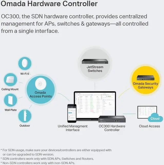 Hardware Controller with Greater Network ManagementLatest Omada SDN hardware controller provides centralized management for up to 500 Omada devices including Omada access points, Omada switches and Omada routers.