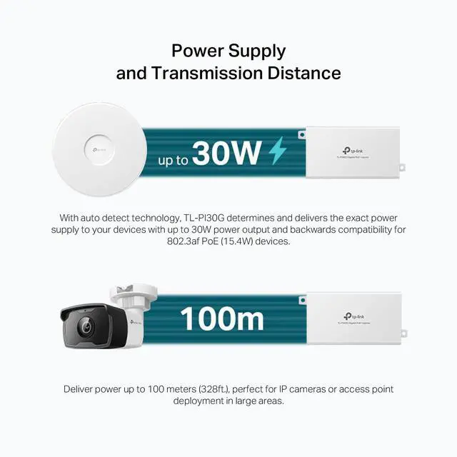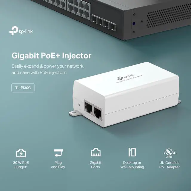 The PoE+ Injector TL-PI30G fully complies with IEEE 802.3 af/at standards, and can work with all IEEE 802.3 af/at PoE compliant PDs (Powered Devices) to expand your network to where there are no power line or outlet, where you wish to fix device such as AP, IP Camera or IP Phone, etc.