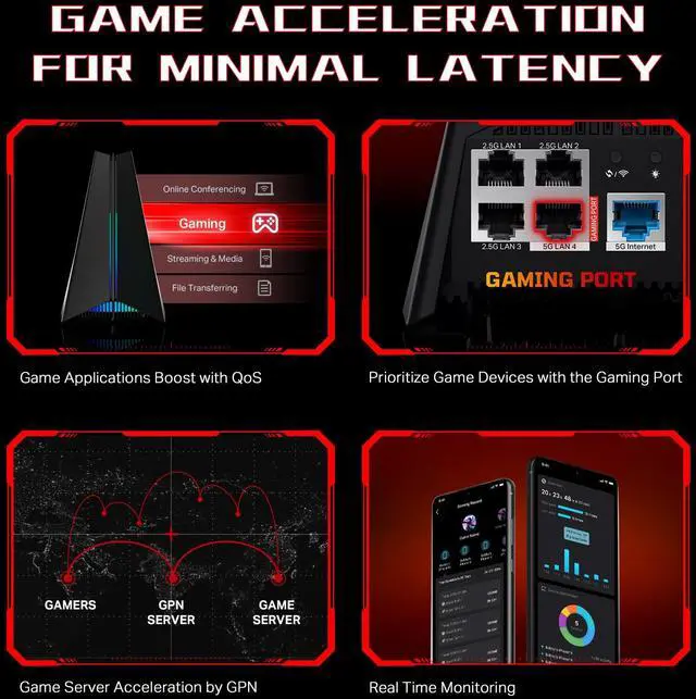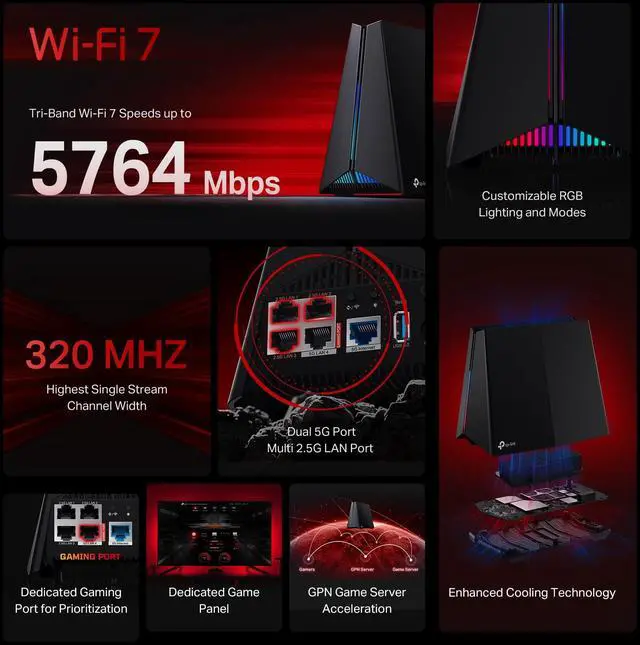 Archer GE650, a tri-band Wi-Fi 7 gaming router, offers speeds exceeding 10 Gbps, powered by a 1.5 GHz quad-core CPU and cutting-edge Wi-Fi chipset. With 2× 5G WAN/LAN ports, its perfect for multi-Gig entertainment such as low-latency gaming, 4K/8K streaming, AR/VR experiences, and home NAS setups. Its game acceleration enhances gaming traffic and stabilizes connections, reducing jitter and lag while lowering ping and boosting speed, ensuring incredible gaming experiences.
