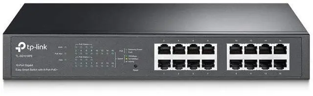 TP-Link TL-SG1016PE 16-port Gigabit rack mount easy smart web-managed PoE+ switch with 8-port PoE+ port, 802.11 at, 110W.