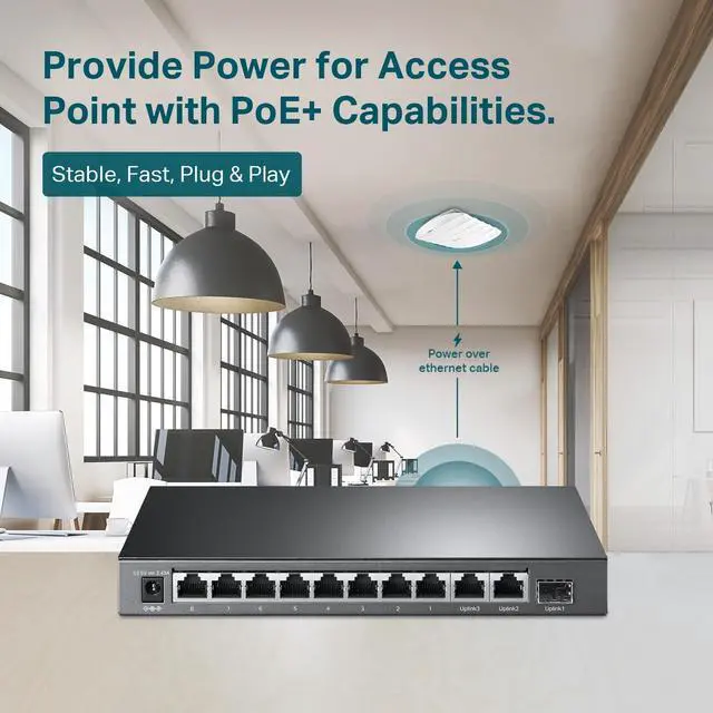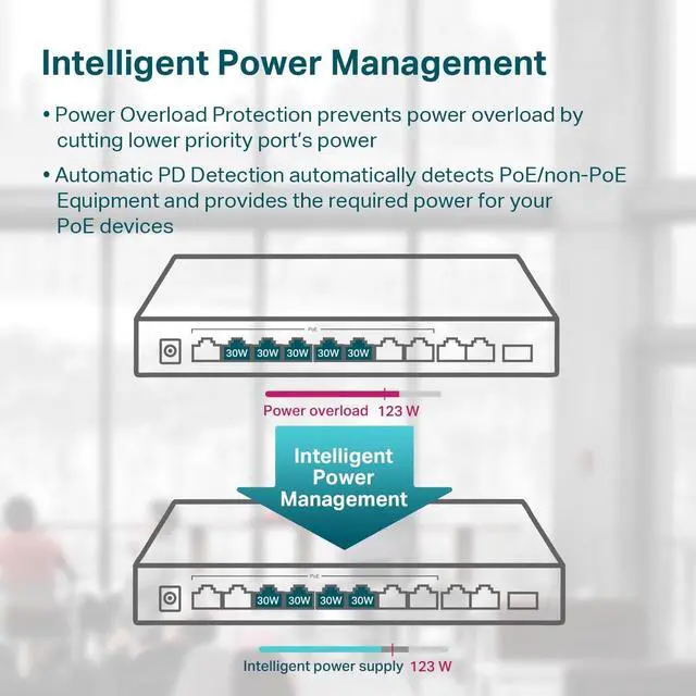 - : 8x PoEplus (802.3at/af) 10/100/1000 Mbps RJ45 ports providing up to 30W per port and total PoE power budget of 123W, together w/ 2x Gigabit Non-PoE Ports and 1 Combo SFP Slot for high-speed connections.
