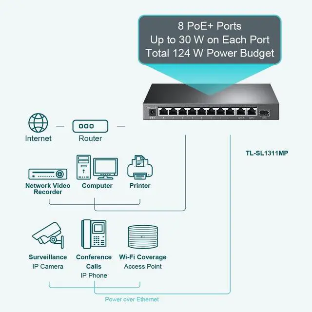• : 8 PoE+ (802.3at/af) ports providing up to 30W per port, total PoE budget 124W