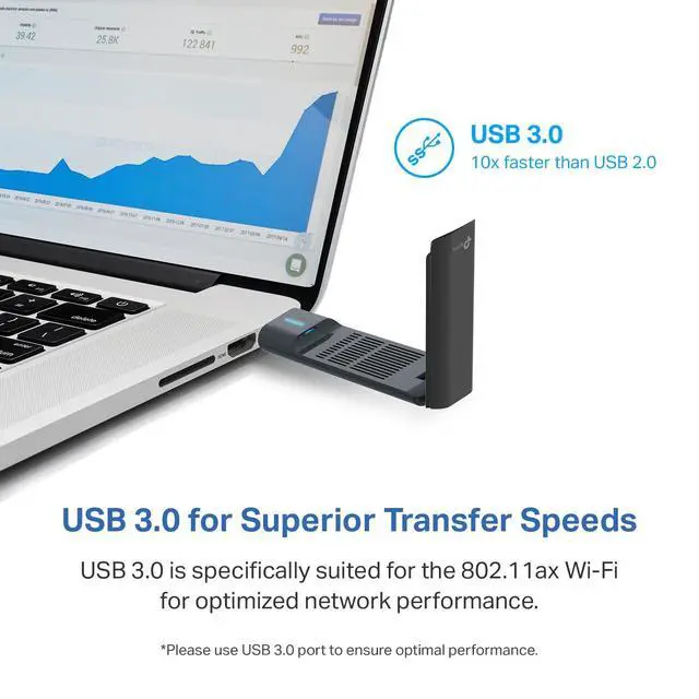 As the perfect solution for gamers and streamers in need of the fastest and most reliable Wi-Fi connection possible, the Archer TXE70UH enhances your Wi-Fi experience in seconds. You can enjoy quicker downloads and uploads of large movie and video game files, smoother streaming of high-definition videos and online gaming, and improved connectivity performance for applications that demand low latency, such as virtual reality and augmented reality using the latest Wi-Fi 6E technology. Featuring the latest USB standard, USB 3.0, download and upload speeds will be up to 10 times faster than traditional USB 2.0.