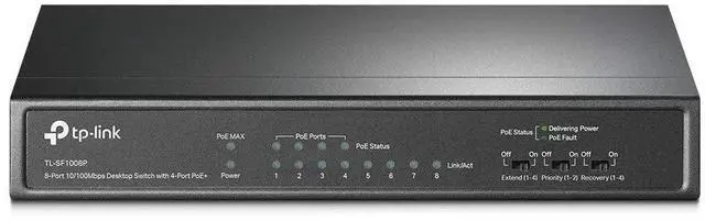Port Priority FunctionPriority (port-1>port-2>port-3>port-4): This function will help protect the system if the system power becomes overloaded. For example, Port 1, 2, and 4 are using 15.4 w (maximum power per port is 15.4W ), the system power is 46.2 w in total (PoE max LED is red). If there is an additional PD inserted to Port 3 with 10w then the system will cut off Port 4 to protect the system; this means that Port 1 and 2 will use 15.4 w, Port3 will use 10w, and no power will be supplied to Port 4. Easy To UseTL-SF1008P is easy to install and use. It requires no configuration and installation. With desktop design, outstanding performance, and quality, the TP-LINK TL-SF1008P8-Port 10/100Mbps Desktop Switch with 4-Port PoE is a great choice for expanding your home or office network. Package ContentsTL-SF1008P switchPower cordPower adapterInstallation guideTP-LINK's PoE Switch SeriesWhich TP-LINK PoE switch is right for me? TL-SG1008PETL-SG1008PTL-SF1008PInterface8 10/100/1000Mbps RJ45 Ports8 10/100/1000Mbps RJ45 Ports8 10/100Mbps RJ45 PortsPoE Standard 802.3 at/af 802.3 af 802.3 afPoE Ports8 (Port 1 - Port8)4 (Port 1 - Port4)4 (Port 1 - Port4)PoE Power Budget124W53W53WMax.
