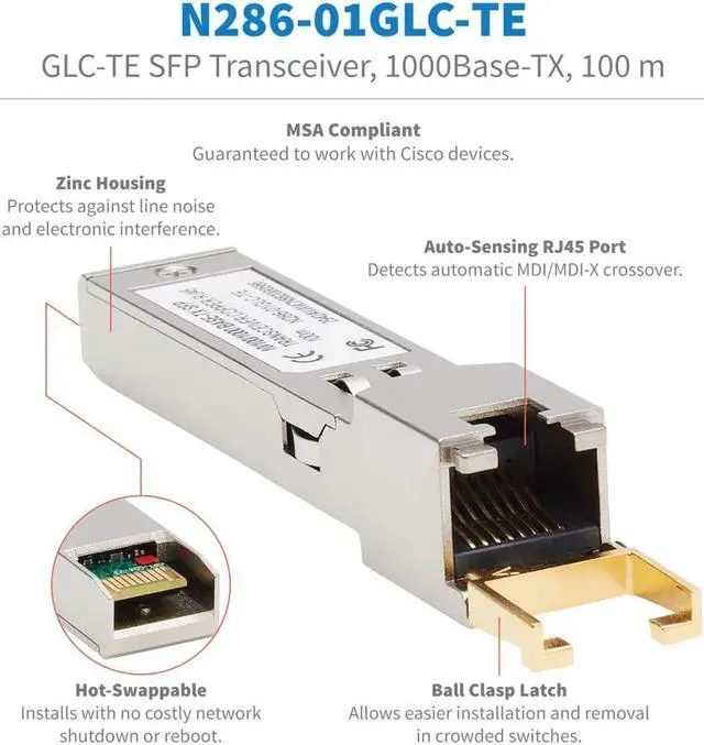 The MSA-compliant N286-01GLC-TE functions just like the equivalent Cisco GLC-TE transceiver module and is manufactured to meet or exceed Cisco specifications. You can use this transceiver with any compatible Cisco router, server or switch and receive the same performance as the GLC-TE.