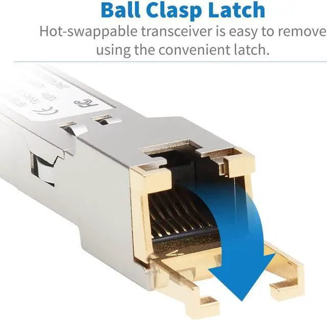 This input/output device is fully hot-swappable, so you can install it without a potentially costly 10/100/1000 Mbps network shutdown or device reboot. Just plug the SFP end of the transceiver into your Cisco network device. The other end has an RJ45 connector to link with high-speed Cat6 patch cable (sold separately). A convenient bail clasp latch helps you carefully remove the module from the device.