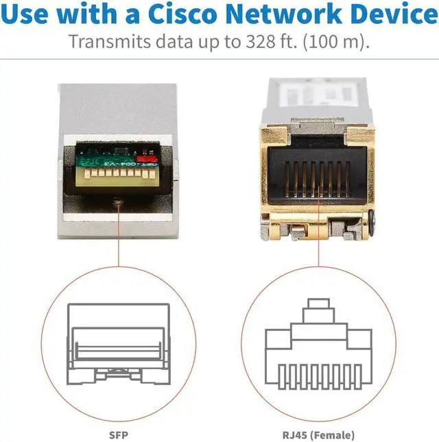 This SFP transceiver allows you to connect a copper Cat6 cable to a 10/100/1000 Mbps fiber network router, server or switch. It transmits data up to 328 feet (100 meters) and supports bi-directional Gigabit Ethernet communication up to 1. 25 Gbps.