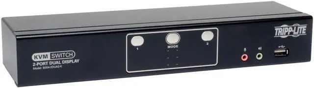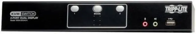 Tripp Lite's B004-2DUA2-K 2-Port Dual Monitor KVM switch allows for the control of 2 computers with Dual Head DVI video cards via a single set of keyboard, mouse, and dual displays. Built-in USB 2.0 and 3.5 mm. Mini Stereo ports provide added functionality, allowing you to share USB peripherals (flash drive, web cam, powered USB hub, etc. ), Speakers ( 2.1 stereo sound), and Microphone amongst the connected computers. Switch between the connected computers using the front panel pushbuttons, keyboard hotkey commands, or a function that allows for switching via the scroll wheel on your mouse.