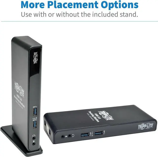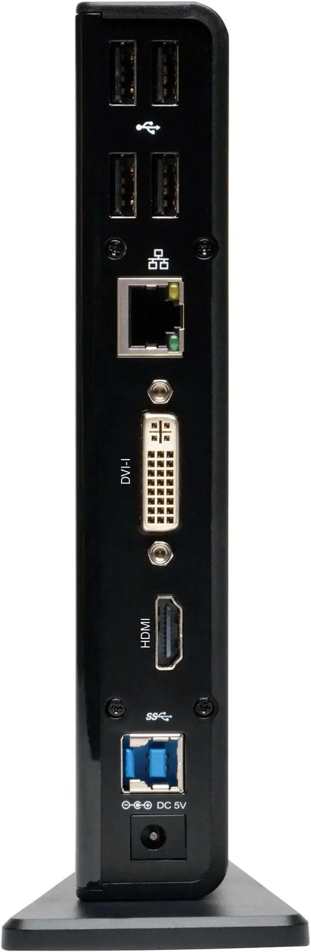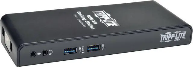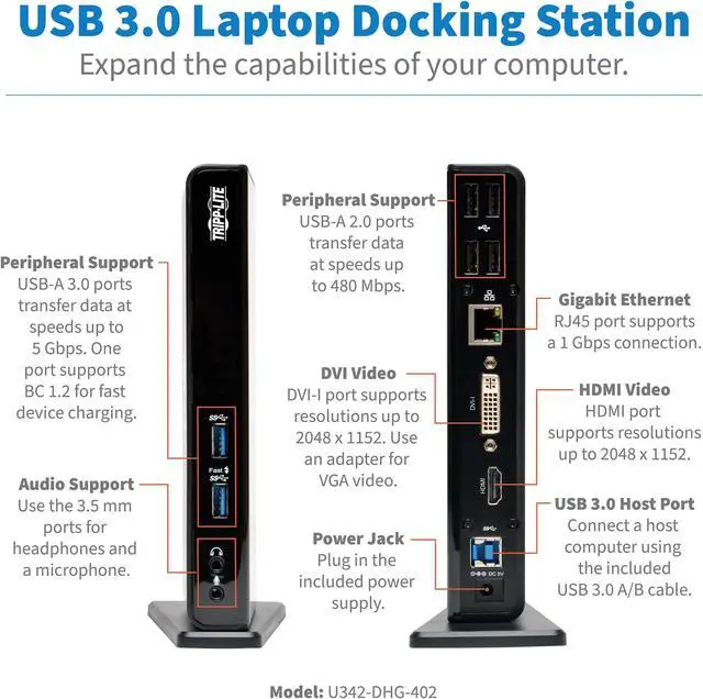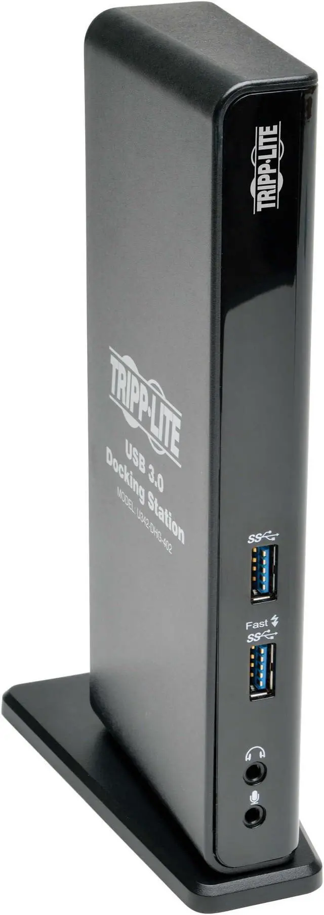 Tripp Lite's U342-DHG-402, Universal USB 3.0 Laptop Docking Station, adds DVI, HDMI, Audio, Ethernet, and additional USB 3.0 and USB 2.0 ports to a laptop computer, all from a single device and over a single SuperSpeed USB 3.0 connection. The universal docking station features two independent external monitor outputs (HDMI, DVI) that can be separately used to expand or mirror your computer's main desktop. Both HDMI and DVI outputs provided by the docking station supports video resolutions up to 1920x1200. An all-in-one solution, the universal laptop docking station combines USB 2.0 and USB 3.0 hubs, headphone and microphone audio connectors and a Gigabit Ethernet RJ45 port into a single docking station, making it the perfect accessory for enhancing laptop capability for users who need to connect and manage multiple devices at home or at the office.