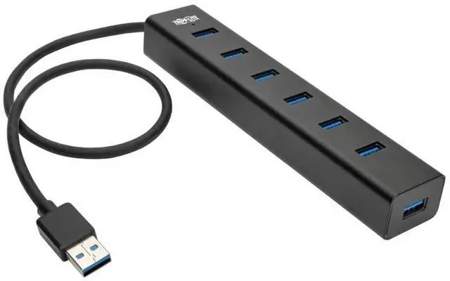 SPEEDS: All seven USB ports transfer images, video and other data at speeds up to 5 Gbps, which is 10 times faster than USB 2.0. The USB ports are backward compatible with previous USB generations, so you can continue using older peripherals while getting high-speed performance from new devices. IDEAL FOR CHARGING MULTIPLE MOBILE DEVICES: The included external power supply provides 5V 3A to be shared among all seven USB ports, which support USB Battery Charging (BC) 1.2. Each port is capable of providing up to 1.5A for fast charging of your phone, tablet, music player and other mobile devices. READY TO USE RIGHT OUT OF THE PACKAGE: The plug-and-play USB hub connects to your computer via its built-in USB cable, saving you the expense and effort of buying and carrying extra cables. It requires no drivers or other software. The included power supply comes with international plug adapters that allow you to connect to almost any AC outlet. The slim aluminum housing fits easily into a pocket, briefcase or laptop bag, so you can set up your workstation anywhere.