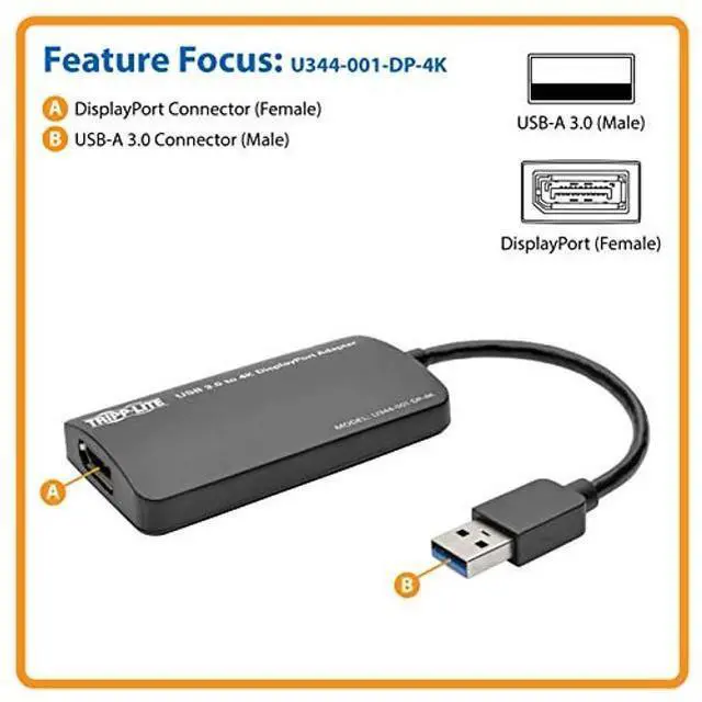 The U344-001-DP-4K USB 3.0 SuperSpeed to DisplayPort Dual-Monitor External Video Graphics Card Adapter allows you to connect a UHD 4K x 2K DisplayPort monitor, projector or television to your computer or laptop's USB 3.0 port, even if your device's graphics card doesn't support UHD resolutions. Ideal for office workstations and on-the-road presentations where using multiple computers isn't an option, this cable lets you extend video across the primary display to a second display, clone the same video on both displays, or set the new display as the primary. It resumes automatically from hibernation and suspend modes.