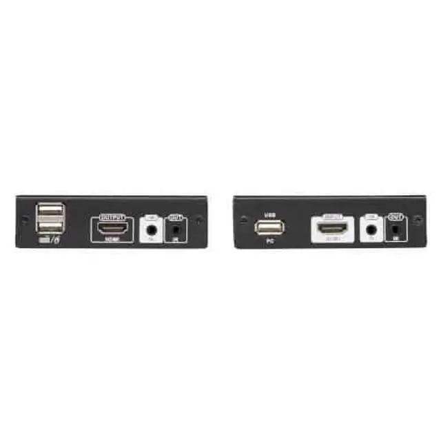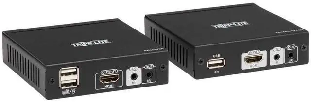 KVM Console Extender for Digital Signage or Extending Video in Offices or Command Centers This extender kit includes a transmitter (local unit) and a receiver (remote unit) that work in tandem to extend and distribute HDMI audio/video USB and IR (infrared) remote signals Using Cat6 cabling (sold separately) the B013-HU-4K transmits 1080p video from a computer Blu-ray player or other media center to an HDMI display or interactive whiteboard located up to 230 feet away By connecting a keyboard and mouse to the receivers dual USB ports you can also control the source device from that same distance Recommended for Digital Signage or Extending Video Across Offices or Command Centers Especially useful in control or security applications the B013-HU-4K is ideal for command centers data control centers banks governments enterprise applications and especially any harsh environments such as factories and warehouses By extending audio/video signals you can safely store your source computer in a cabinet or other enclosure keeping it free of dust and blocking noise created by its fans while watching the display in a different room or even a warehouse or factory floor Transmits Both 1080p and Uncompressed 4K Video and LPCM Audio with Zero Latency This HDBaseT kit extends 1080p video resolutions up to 230 feet as well as 4K video (3840 x 2160 at 30 Hz) up to 130 feet with 24-bit Deep Color (8 bits per channel) It also supports uncompressed LPCM compressed DTS-HD and compressed Dolby TrueHD audio with no signal loss or added latency IR Pass-Through Technology Lets You Control the Video from the Next Room Full bi-directional IR extension lets you control the source device with its remote (play pause fast forward etc )