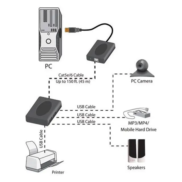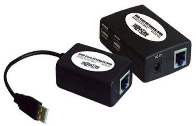 Tripp Lite's 4-Port USB 1.1 over Cat5 extender hub allows USB 1.1 peripherals to be located up to 150 ft. from your computer. Simply plug the transmitter into the USB port on your computer, connect your USB peripherals, and run Cat5e/Cat6 cable up to 150 ft. to the remote receiver unit and connected devices. Plug-and-play; no software or drivers required. 1 year limited warranty.