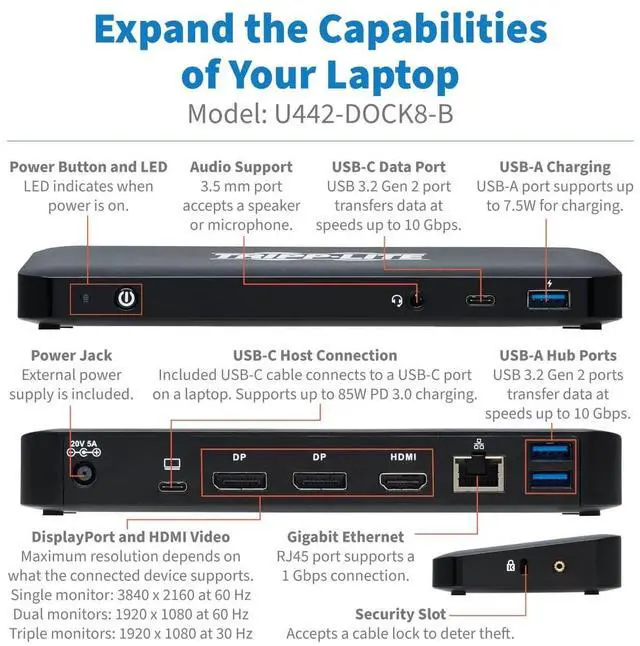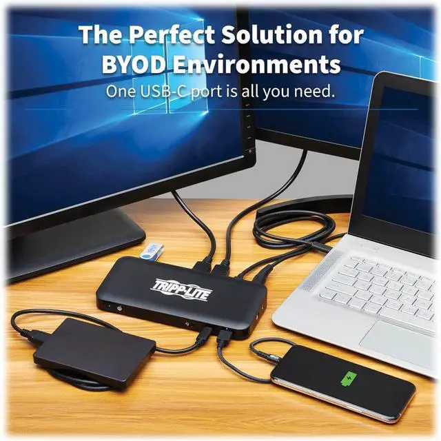 NEW PORTS: This universal USB-C dock with PD Charging expands the potential of your Windows laptop, Chromebook, MacBook Pro, smartphone or PC's USB-C or Thunderbolt 3 port. Connect the dock using the included USB-C cable, and add 10 ports to your device: 4K HDMI, (2x) 4K DisplayPort, RJ45 Gigabit Ethernet, USB 3.2 Gen 2 Type-C, (3x) USB 3.2 Gen 2 Type-A, USB-C PD charging, and 3.5 mm mini stereo/headphone port. SUPPORTS USB-C DISPLAYPORT ALTERNATE MODE FOR TRANSMITTING AUDIO/VIDEO SIGNALS: By connecting the detachable USB-C cable to a source device that supports USB DisplayPort Alt Mode, you can output 4K video and digital audio to a compatible monitor, television or projector without installing special software drivers. TRANSMITS CRYSTAL-CLEAR 4K VIDEO AND DIGITAL AUDIO WITH 4:4: 4