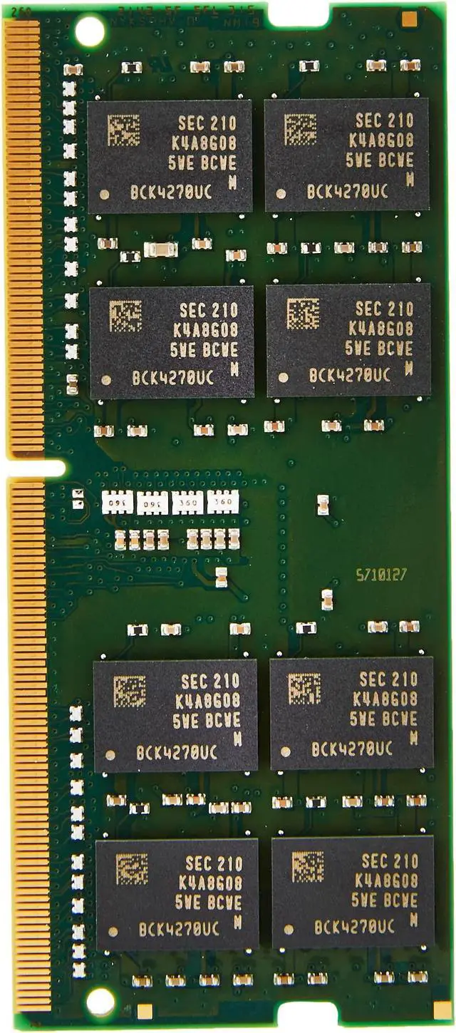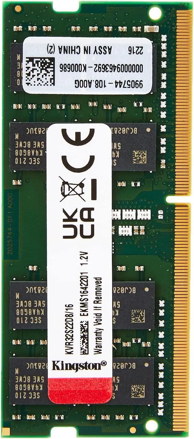 This describes ValueRAM's KVR32S22D8/16 as a 2G x 64-bit (16 GB) DDR4-3200 CL22 SDRAM (synchronous DRAM), 2Rx8, non-ECC, memory module based on sixteen 1G x 8-bit FBGA components. The SPD is programmed according to JEDEC standard DDR4-3200 timing latency of 22-22-22 at 1.2 V. This 260-pin DIMM uses golden contact fingers. The electrical and mechanical specifications are as follows. FEATURES- Power supply VDD = 1.2 V typical; * VDDQ = 1.2 V typical; * VPP = 2.5 V typical; * VDDSPD = 2.2 V to 3.6 V; * Nominal and dynamic on-die termination (ODT) for data, strobe and mask signals; * Low-power automatic self-update (LPASR); * Data business conversion (DBI) for the data bus; * VREFDQ generation and calibration on the chip; * Dual rank; * Integrated serial I2 Presence Detect (SPD) EEPROM; * 16 internal banks 4 groups of 4 banks each; * The burst chop (BC) was set to 4 and the burst length (BL) to 8 corrected via the Mode Register Set (MRS); * Selectable BC4 or BL8 during operation (OTF); * Fly-by topology; * Control command and address bus finished; * PCB height 1.18 inches ( 30.00 mm); * RoHS compliant and halogen-free