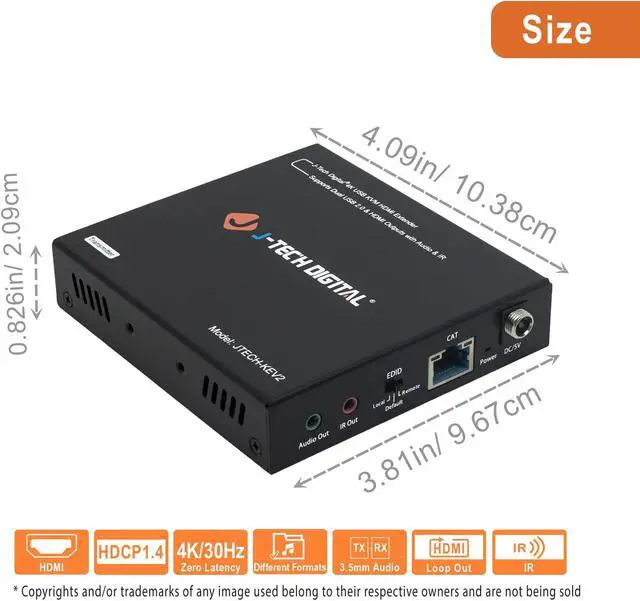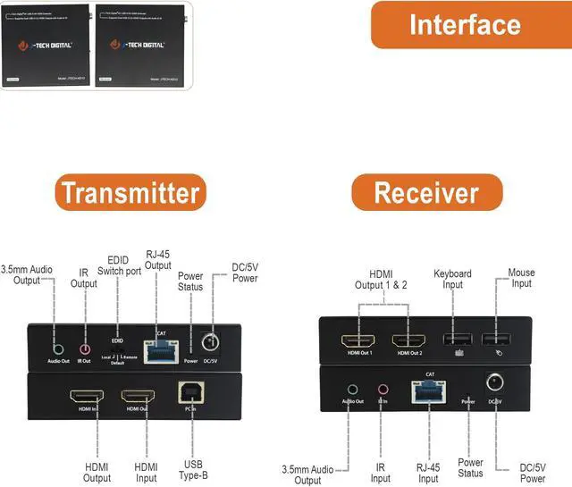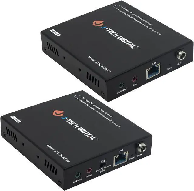 The J-Tech Digital JTECH-KVE2 HDMI & USB 2.0 KVM extender allows users to extend USB keyboard, mouse and HDMI signals up to 328 feet over CAT6 ethernet cable with near zero latency. This allows users to control a computer (or USB device) remotely up to 300+ feet away. Connect two remote HDMI displays to the receiver's dual HDMI output ports and one local HDMI display to the transmitter's local loop HDMI output port for flexible monitoring options. Extract source audio via the 3.5 mm analog audio output ports found on both the transmitter and receiver so that users can route audio to a 3rd party audio processor/amplifier.