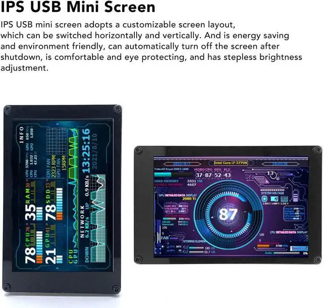 Use: Computer temp monitor is mainly used for host temperature monitoring, and it is suitable for AIDA64 software. There is no need for additional power supply, just a USB data cable to connect the screen to the computer, and then start the software.