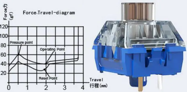 • Operating Force: 45 +- 10gf, Tactical Force: 60 +- 10gf, Travel: 2.0 +- 0.4mm, Total Travel: 3.6 +- 0.4gf, Mechanical Life: 100 million times