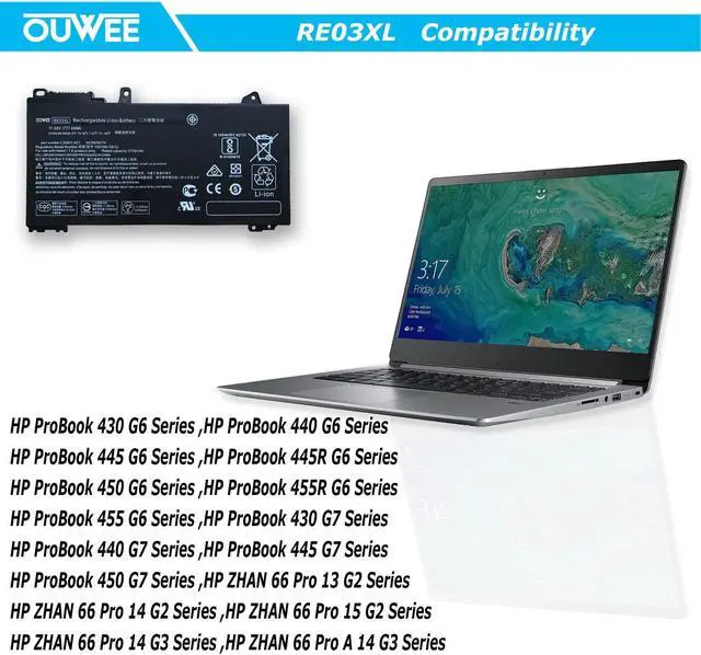 Replacement for Part Number: RE03XL HSTNN-0B1C HSTNN-DB9A HSTNN-OB1C HSTNN-UB7R L32407-2B1 L32407-2C1 L32407-541 L32407-AC1 L32656-002 L32656-005 9. Compatible Models (use "Ctrl+F to find your model quickly") Fit for HP ProBook 430 440 445 450 455 445R 455R G6 Series Notebook Fit for HP ProBook 430 440 445 450 G7 Series Notebook Fit for HP ZHAN 66 Pro 13 G2 Series Notebook Fit for HP ZHAN 66 Pro 14 G2 Series Notebook Fit for HP ZHAN 66 Pro 14 G3 Series Notebook Fit for HP ZHAN 66 Pro A 14 G3 Series Notebook Fit for HP ZHAN 66 Pro 15 G2 Series Notebook 10.