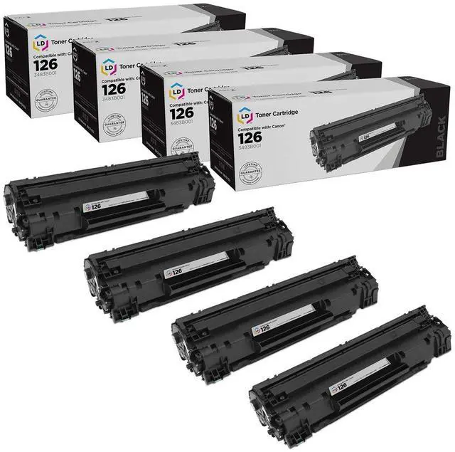 Compatible Replacements Included: 4 pack 3483B001 black ^^ Canon 126 Toner Cartridges ^^ Standard Yield ^^ Delivers 1, 700 pages just like the original Canon 126 compatible toner cartridge ^^ Average cartridge Page Yield* in accordance with ISO IEC 24711. *at 5% coverage (ISO/IEC standard) ^^ This is the standard yield version of Canon compatible toner cartridge CRG126 ^^ Please contact us first with any product issues. We want all of our customers to be happy because happiness matters.