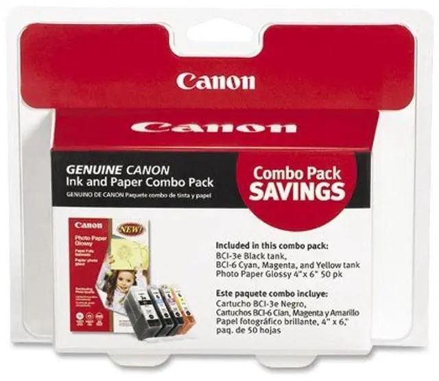 Ink and photo paper combo pack contains one each of bci-3e black, bci-6 Cyan, bci-6 Magenta, bci-6 Yellow, and one 50-sheet pack photo paper glossy 4" x 6". designed for use with Canon I560, I860, PIXMA iP3000, PIXMA iP4000, PIXMA iP4000R, PIXMA iP5000, PIXMA MP750, PIXMA MP760 and PIXMA MP780 photo all-in-one.
