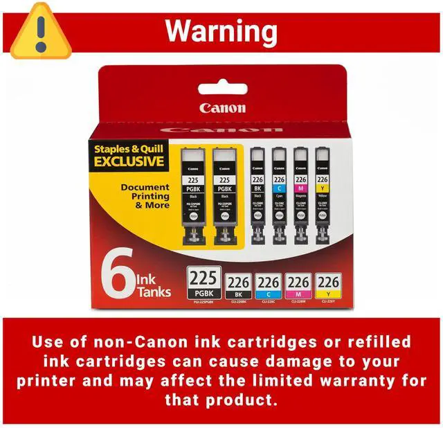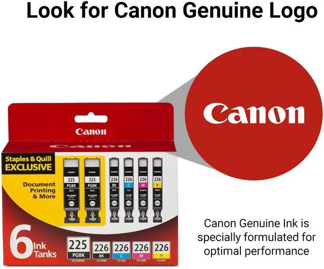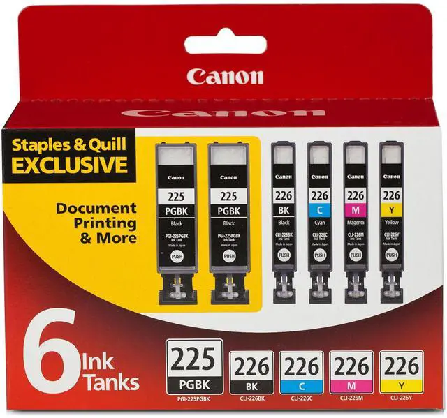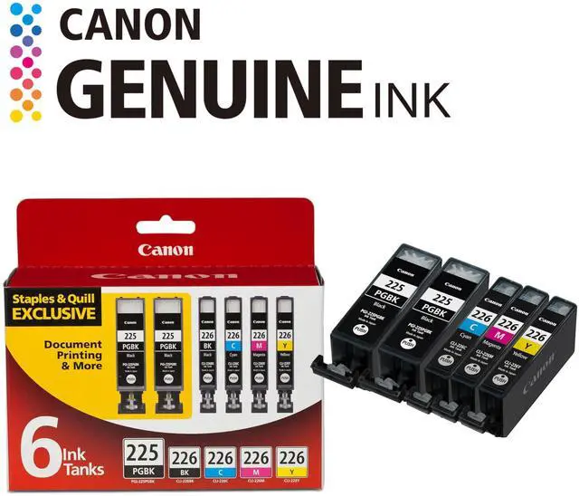 Create long-lasting prints that resist fading with this 6-pack of black and color ink cartridges. The standard page yield is ideal for use in home or small offices, and the cartridges are simple to install in select PIXMA machines for added convenience. These Canon ink cartridges feature an individual tank system to improve efficiency, while the vivid inks help text and images stand out. This package includes two PGI-225 black cartridges and one of each 226 black, cyan, magenta, and yellow cartridges.