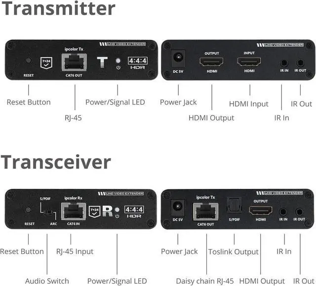 ARC - Connects through the Toslink optical port of the transceiver to the display's ARC sink IR Control - Built-in bi-directional IR provides full remote control capabilities, control the HDMI source device at the remote display location and vice versa, IR blaster and receiver cables included
