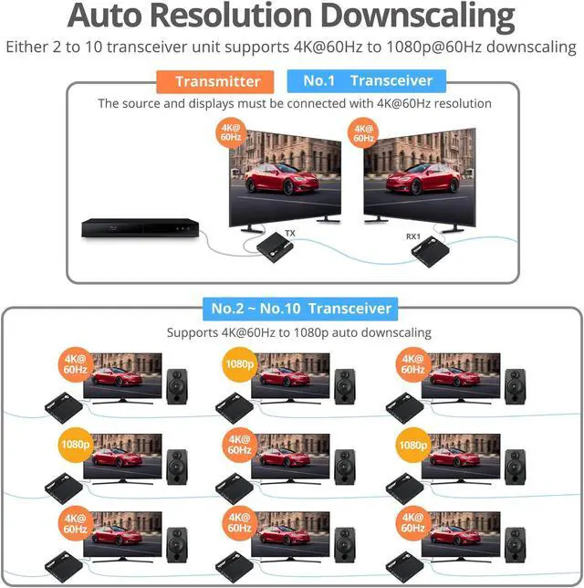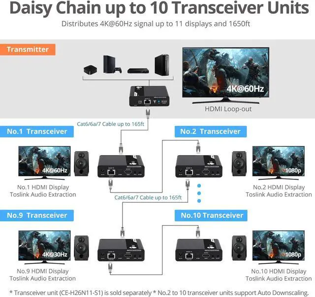 Multiple Transceiver Extension - Supports daisy chain up to 10 transceivers to further extend HDMI signal up to 165ft to each transceiver Note: Additional Transceivers, part# CE-H26N11-S1, sold separately Audio Extraction - Extracts digital audio from the HDMI signal and routes it through the transceiver's digital Toslink port, supports PCM, Dolby 5.1, DTS 5.1 audio output signal