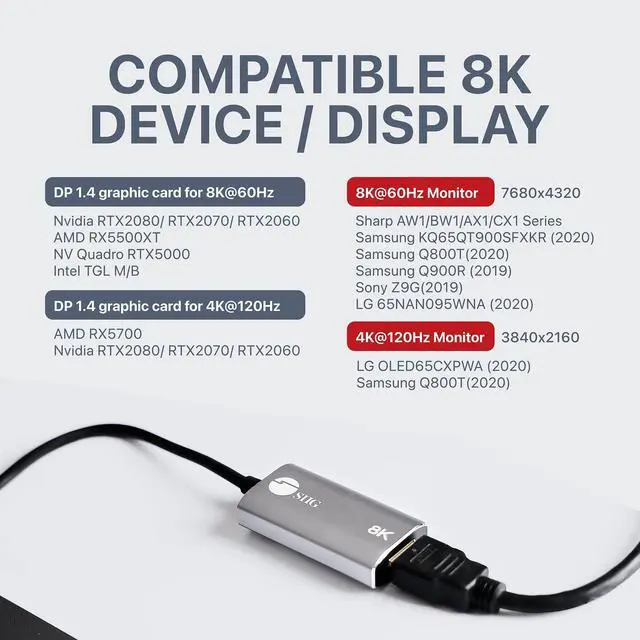 Video resolution: 720p, 1080p, 4K30Hz, 4K60Hz, 4K120Hz (w/DSC), 8K30Hz and 8K60Hz (w/DSC)