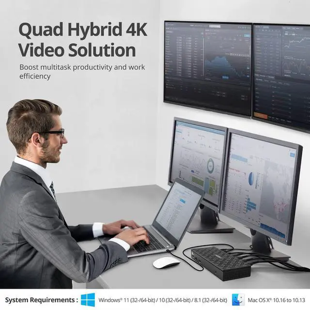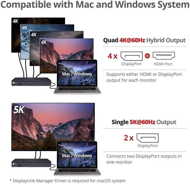 ^^ Quad Monitor Display: Our USB-C docking station features 4x HDMI outputs (or 4x DisplayPort outputs), including 4x 4K@60Hz (DP & HDMI) mix outputs, using DisplayLink USB graphics technology. Extra monitors for extra productivity. ^^