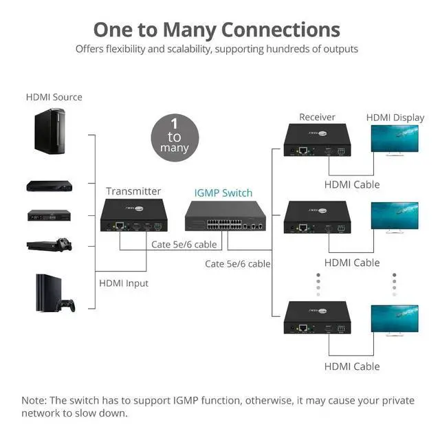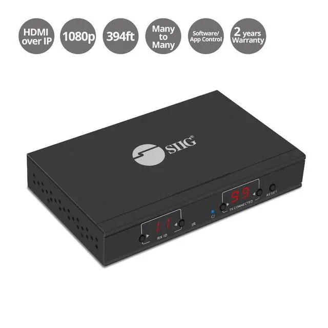 Note: Dedicated unmanaged IGMP Gigabit Switch is recommended for best performance and reliability ^^ Supports up to 1080p @60Hz video resolution to deliver stunning and crystal clear images. Supports computer control software to select and switch between source devices (Matrix only) ^^ Supports IR pass back function to control the source device from RX location. Supports Hobbit-T protocol with H. 264 compression over IP ^^ HDMI output on the transmitter allows you to monitor the HDMI signal at the source location. RS-232 pass-through connection to control RS-232 enabled devices in either direction
