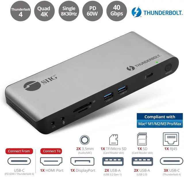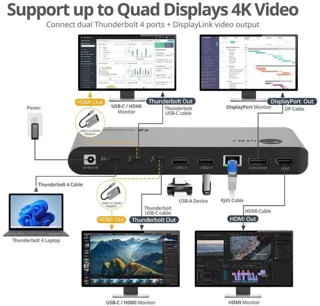 Docking Station: With 15 connecting ports in total, this Thunderbolt 4 docking station (JU-DK0U11-S1) creates an ultimate workstation for your laptop, such as MacBook Pro or Windows. It is capable to connect multiple devices, video, ethernet, memory cards, and power through a single Thunderbolt 4 cable. It gets up to 40Gbps data transfer speeds, which is 8 times faster than USB 3.0. ^^ Quad 4K