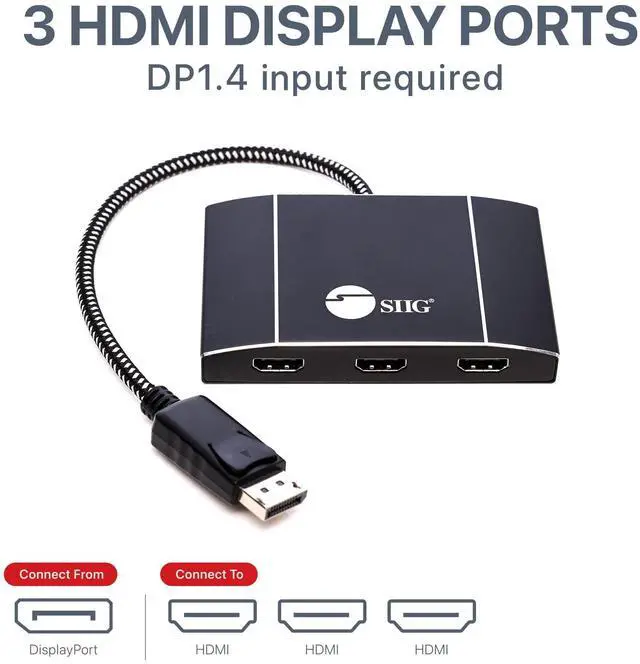 IMPORTANT NOTES -!!! No Support for MacOS!!! -!!! DisplayPort 1.4 GPU/ Graphics Card required. Requires GPU/Graphics card supporting more than 3 external screens. Intel HD Graphics are limited to 3 external screens altogether. See Product Description for more important information. Contact us before purchasing if you are not sure about compatibility. Boost your productivity by connecting three HDMI screens to single DisplayPort 1.4 output with Multi-Stream Transport (MST) technology ^^ 3 PORT DISPLAYPORT TO HDMI SPLITTER MST HUB - Connect 3 HDMI screes to your system through a single DisplayPort 1.4 output on your computer.