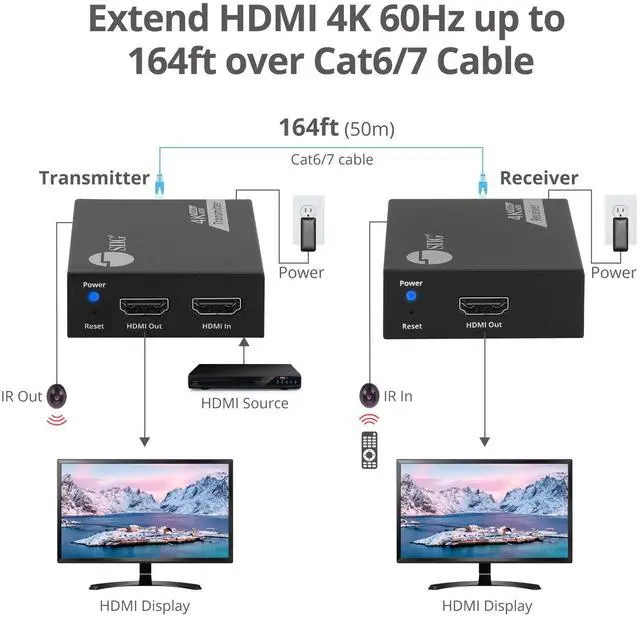 ULTRA-HIGH DEFINITION: Transmit high-quality audio and video up to 164ft with our 4K HDMI extender over Cat6. It supports HDCP 2.2, 5.1 channel audio, and auto downscaling for seamless device compatibility.
