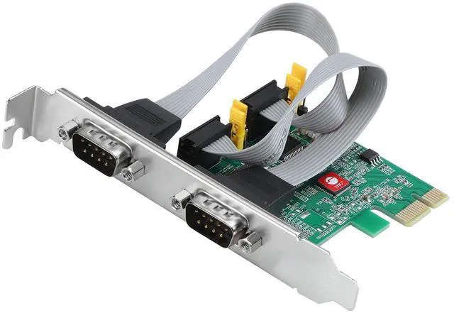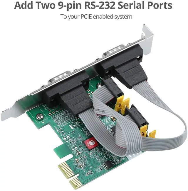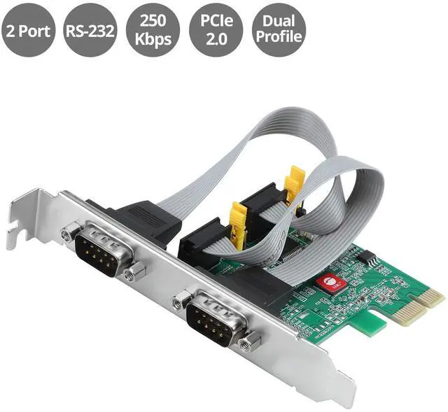 Adds two 9-pin RS-232 serial port to PCIe enabled desktop computers, each port supports data transfer rate up to 250Kbps, Compliant with PCI Express 2.0 Gen 1 ^^ Single-lane (x1) PCI Express End-point Controller with PHY integrated; Full serial modem control with hardware and software flow control; Supports 5, 6, 7, 8 and 9-bit serial formats, and Even, Odd, None, Space and Mark parity; On chip 256-byte FIFO buffers in transmit and receive path for each serial port ^^ Works as either standard RS-232 port or with 5V or 12V power output for devices that require power (such as handheld scanners, table scanners, POS displays and many more).